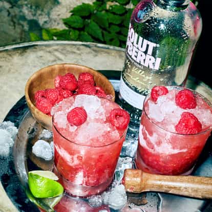 Zerdrücke die Himbeeren zusammen mit dem Zuckersirup direkt in einem Rocks-Glas. Fülle das Glas mit Crushed Ice auf, gib Absolut Raspberri hinzu und rühre um. Garniere den Drink mit einer Himbeere.