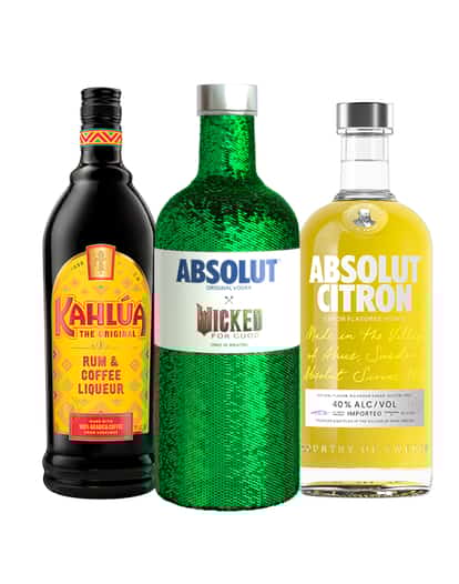 – One bottle of Absolut Original Vodka (750ml, 40% ABV), housed in a color-changing pink and green sequin sleeve. – One bottle of Absolut Citron Vodka (750ml, 40% ABV), gluten-free and made with premium Swedish winter wheat. – One bottle of Kahlúa Original Coffee Liqueur (750ml, 20% ABV), featuring high-quality ingredients like Arabica coffee and sugarcane from Mexico.